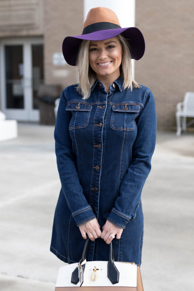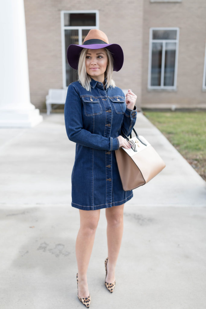 Denim Dress (LOVE this one), Hat, Purse, Lipstick