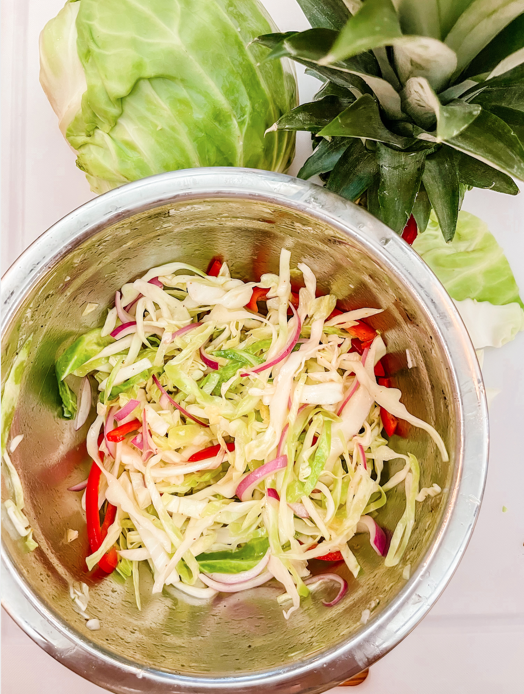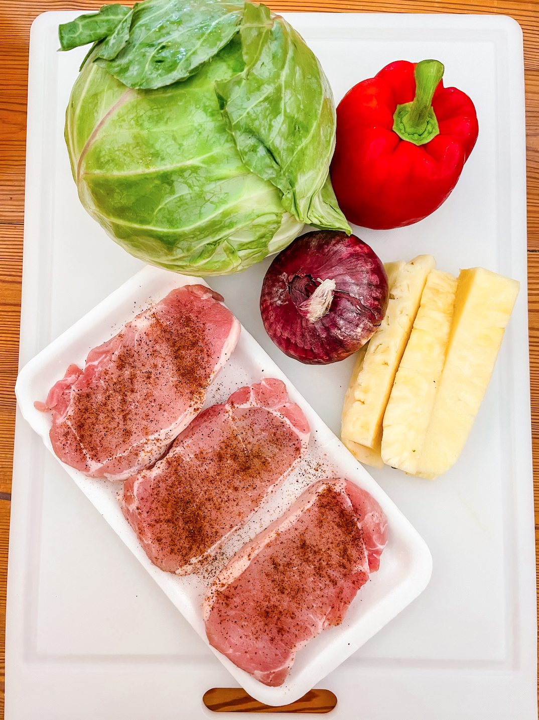 I wish I would have poured the chili slaw sauce on my pork chops heated for more flavor but I mixed the slaw + pineapple + pork chops together for a bite, and YUM!