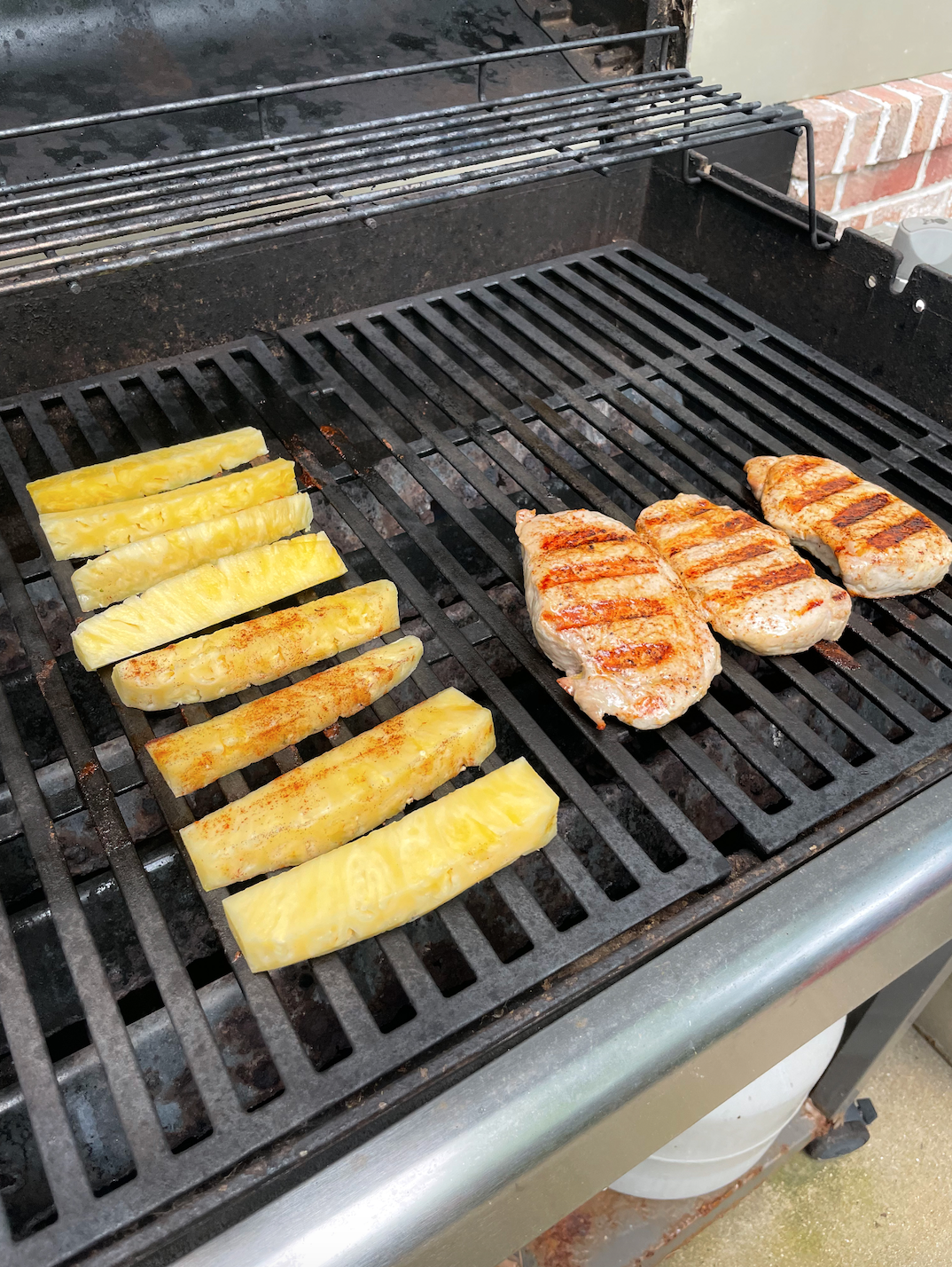 Add your pineapple sprinkled in cinnamon on the grill for 8-10 minutes while your pork chops finish cooking.