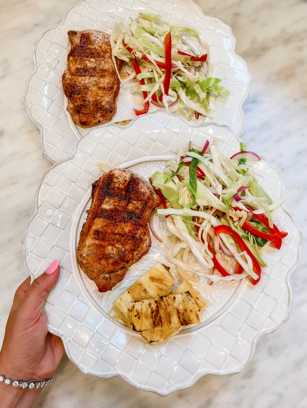 We love Pork Chops + Grilled Pineapple so those pair so nicely together plus adding in the Chili Coleslaw was amazing (IF you have time to fix in AM before dinner, it is way better after it has sat, but I didn’t today – it was still good! The dish is so flavorful and was SUPER easy to make (plus under 400 calories + makes for great leftovers)!